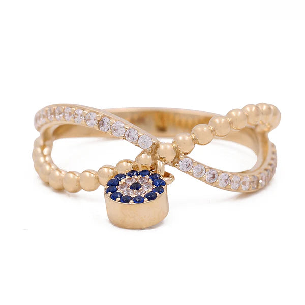 Embrace beauty with meaning in this 14K yellow gold women’s ring, featuring a striking blue and white eye design accented with sparkling cubic zirconia. Often seen as a symbol of protection and clarity, the eye motif adds a spiritual touch to a modern, fashion-forward piece.